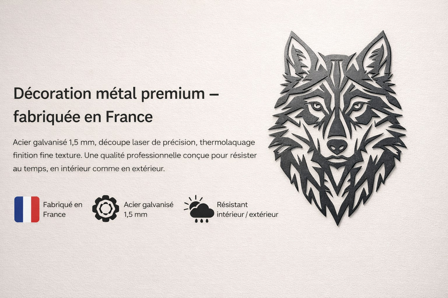 Nos décorations murales sont fabriquées en acier galvanisé de 1,5 mm d’épaisseur, un matériau reconnu pour sa solidité et sa durabilité.